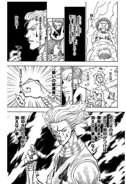 能力の説明で焦らされたヒソカが動こうとするが、クロロは最後に最も重要な情報を話す。
